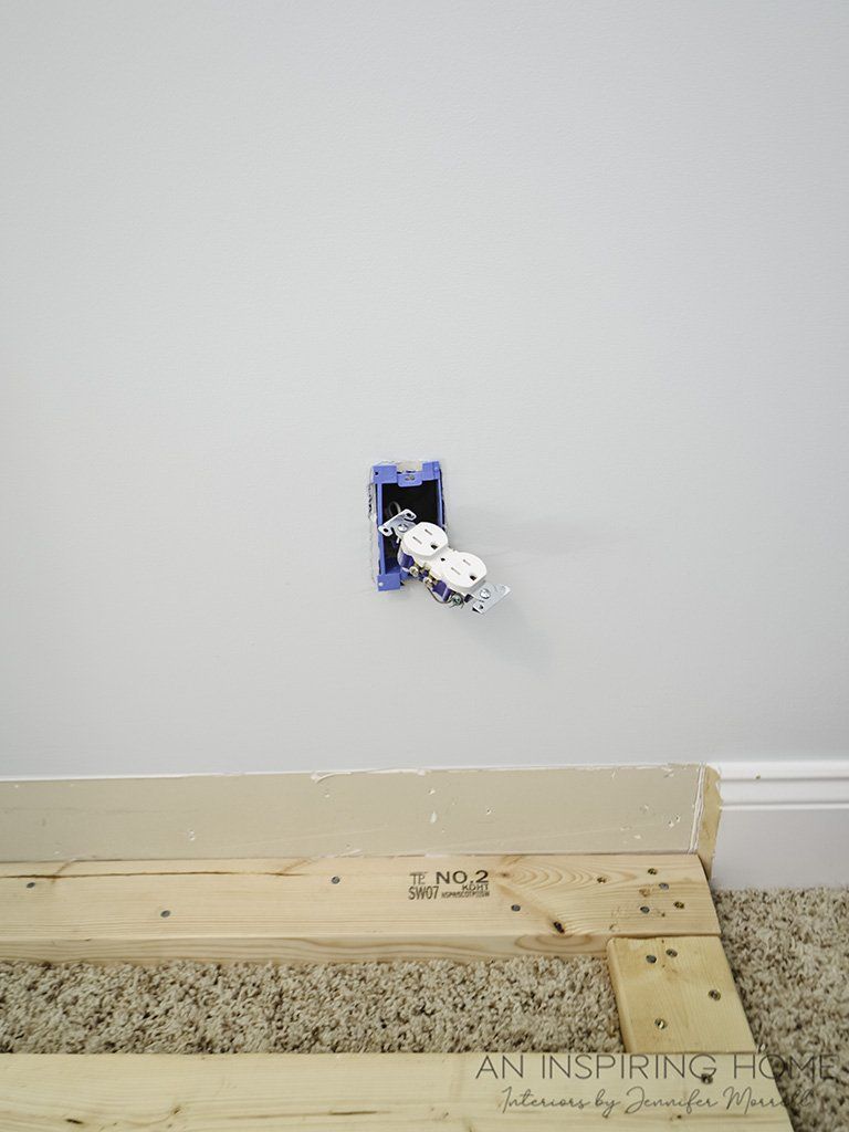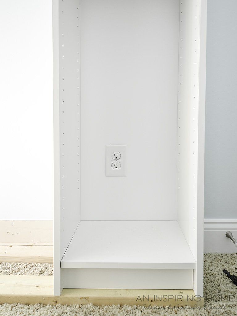 If you have any outlets you want to have access to, measure and cut out an opening in the back of your bookshelf. Then use an outlet box extender to help secure your outlet on the inside of your bookshelf.