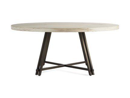 When you have a round table in a dining room you can fit a lot of people around it which is perfect for conversation or even playing games. I selected a blue buffet and a deep orange rug to complement each other. Everything else is pretty neutral while the gold chandelier and sconces add some bling.