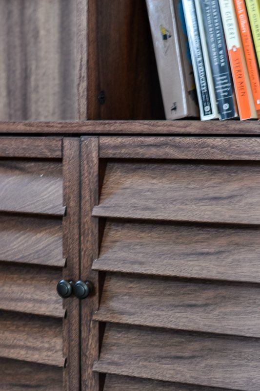 Take a closer look at some of the details. I love the vintage detail on the side table as well as the bookcase doors. The drapes are a tweed-like linen fabric and add another great texture to the space.